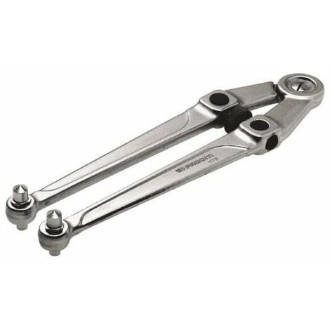 Pour écrous à trous latéraux. Finition chromé. Ergots amovibles doubles et ronds, pour écrous percés sur face. Capacité 20 à 100 mm. Réf. 39661-1 : clé livrée avec 1 jeu complet de 8 ergots et 1 jeu de 2 ergots de rechanges. Réf. 39661-2-3-4-5 : ergots de rechange doubles et ronds.