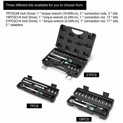 7PCS (entraînement 3/8 pouces): 1 * clé dynamométrique (10-60N.m), 3 * tiges de connexion, 3 * embouts