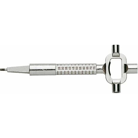 Clé de chantier multifonction ; Clé forée carrée 6/7/8mm ; Clé à six pans 3mm ; Broche mandrin conique carré de 6 à 10mm ; Panneton d’entraînement pour serrure à cylindre ; Profil avec graduation double (22 – 75mm et 25 – 75mm) pour déterminer la longueur du cylindre ; Décapsuleur ; En alliage zingué