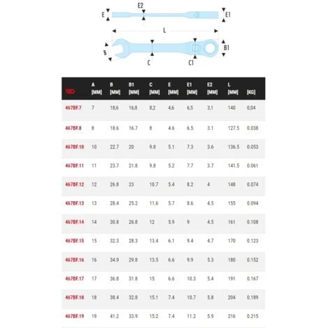 La clé mixte à cliquet 467BF est conçue avec une tête articulée permettant d’atteindre les écrous difficiles d’accès. Son mécanisme à cliquet est compact et est réversible par retournement de la clé.