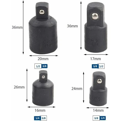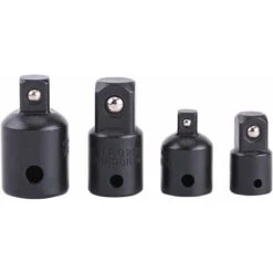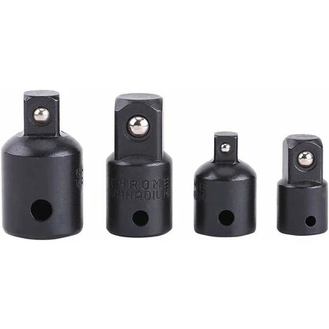 Il s’agit d’un ensemble de 4 pièces durables adaptateurs de réduction et d’augumentation. La construction en acier au chrome-vanadium robuste est conçue pour être utilisée avec des clés à cliquets. Une finition en oxyde noir rend chaque pièce résistante à la corrosion et très durable. La butée à billes à ressort maintient vos douilles fixes et sécurisées. Il y a une gamme de tailles pour adapter de nombreuses combinaisons de douilles ou de clés, y compris 1/2″(M)–3/8″(F), 3/8″(M)–1/4″(F), 3/8″(M)–1/2″(F) et 1/4″(M)–3/8″(F).
