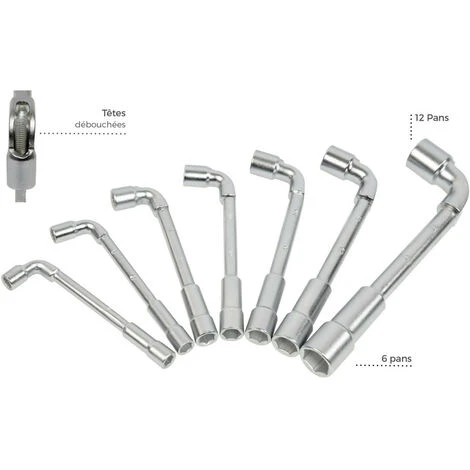 Le jeu de 7 clés à pipe débouchées permet le dévissage des écrous même munis d’une tige filetée dépassante grâce à leurs têtes débouchées. Le jeu contient 7 clés de haute qualité et très résistantes fabriquées en acier au carbone avec finition satinée. Les clés à pipes sont munis sur la partie coudé de 12 pans, et sur la partie droite de 6 pans.