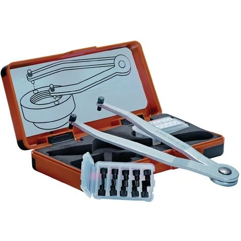 pour écrous à deux trous · avec tenons trempés interchangeables · remplace 5 tailles de clé individuelles · clé en acier spécial, galvanisée