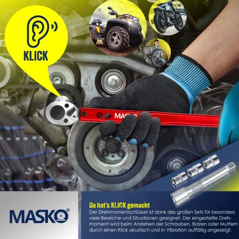 MASKO 6 pièces. Jeu de clés dynamométriques comprenant 3 embouts, une rallonge pratique et une boîte de transport solide.