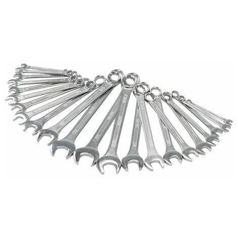Ensemble de clefs mixtes en acier chrome-vanadium matricé trempé et revenu à faces polies et manches à embrasure.