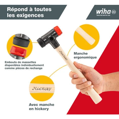 Carrelage, dallage, mise en place de bordures, construction de maisons préfabriquées, travaux de jardinage et paysagers. Travaux de montage et démontage, tôlerie, artisanat, atelier. Logement : coquilles de sécurité en fonte avec des rainures pour l’assemblage des embouts et du manche. Normes : certifié GS : sécurité testée. Têtes de frappe : noir : caoutchouc mi-souple, résistant à l’usure.Orange transparent : acétate de cellulose dur, résistant à l’usure. Manche : manche en hickory avec profil ergonomique et surface antidérapante.